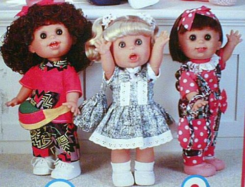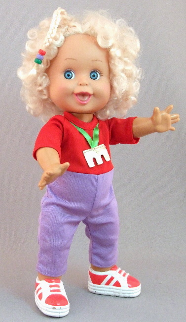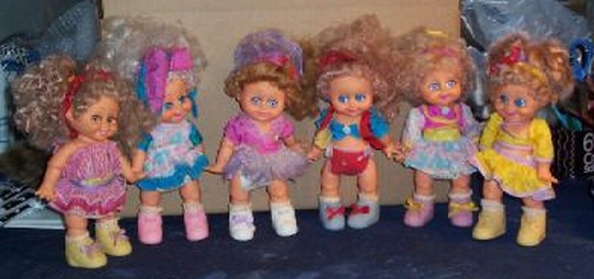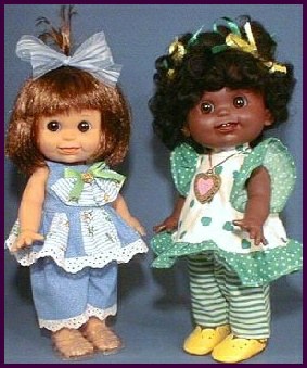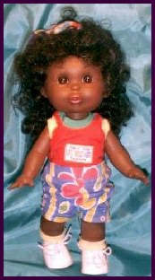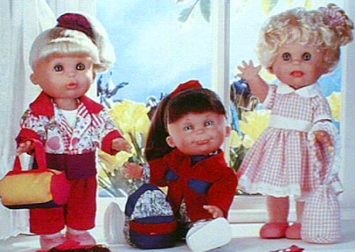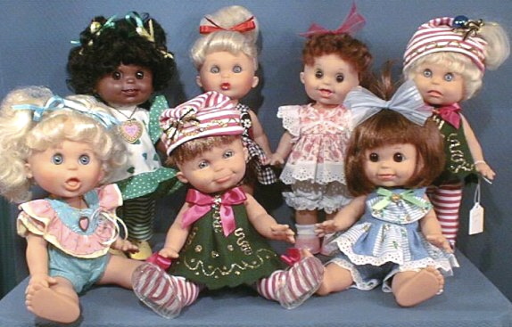 In addition to the six Angel Face dolls that are pictured on the box, we know of three black dolls and a white doll that is a variation (shown in the photos above.) We do not know if these other dolls were sold as Angel Face. All of them have the Berjusa ID on their neck. The black doll in the photo on the left was purchased off of ebay. We don't know if the outfit is original. Probably not. The shoes are replaced. She is pictured next to the white doll with the same face mold. Debbie, who operates the Medolls web site, says that she purchased her black doll from QVC. Debbie's black doll is the one wearing the red shirt. The outfit is original and the shirt says "Only for Kids Fashion." Debbie says that QVC sold another black doll at the same time, which she did not purchase. It did not look like the doll in green, it had a different face. She does not remember if it was sold as "Angel Face" or not. The white doll on the far right is all original. She has freckles and the same hairstyle as one of the Angel Face dolls, but her original outfit is unlike any of the other Angels. Her face mold is the same as the sad doll. She is a variation of unknown origin. Thank you to Francine of BabyFaceDolls.com for the photo. |