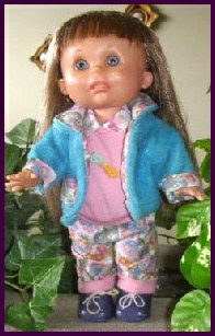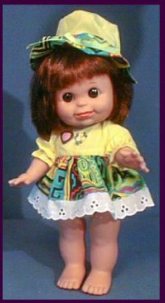 However, my impression of this little doll is that it is grotesque compared to Baby Face DeeDee. (The photo actually makes her look better than real life.) The expression is not sweet. The materials seems cheap by comparison. It is not very poseable at all, despite all the joints. I could hardly get it to stand up. I like the Berjusa dolls but I do not care for this little character much at all. Here are more pictures of Miss Pretty: