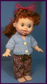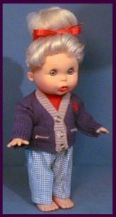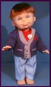The Angel Face dolls by Berjusa are 12 inches instead of 13, but the difference is all in the size of the head because their body is the same height and size as Baby Faces. They wear the same dress size, the same pant size, and the same shoe size. The Angel Face dolls do not have the extra joints at elbow and knee, and they are not of the same quality. The body is a cheap plastic, and the head and arms are vinyl. Their faces are expressive, but in a different way than Baby Face. I think they look like little gnomes. I do find them appealing and it is tempting to collect them. Apparently the Angel Face dolls do not have names assigned. Here are two original photos from an Angel Face box: