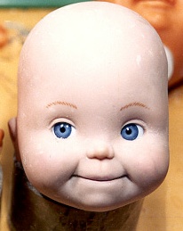 I pressed out and "refined" the bodies in a few days, The Sculpy hardens when it is baked in the oven and then it can be sanded and refined even more. All three bodies were the same. Then I did the heads. I found hard plastic beads the same size as the eyes I had chosen, The beads were bake-o-lite or something, that wouldn't melt in the oven. I pressed a shell of Sculpy into the inside of the molds of the front and back of the heads, setting the beads in place and packing the Sculpy around them. Then I filled the remaining cup-like cavities with crumbled bits of dried up Sculpy and joined the fronts and backs with a seam of crazy glue along the edge where the soft Sculpy shells met, Crazy Glue works quite well on Sculpy either before or after it is baked. Then I carefully removed the mold trying not to mess up the soft Sculpy and with