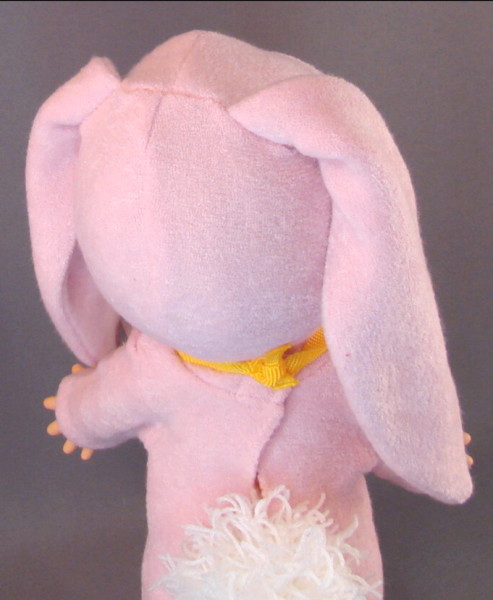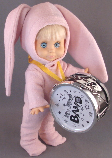 Velcro is used to fasten the hood of the bunny suit, under the chin. Arrange the floppy ears the way you like. You can decorate the ears with a bow or flowers, if you so desire.