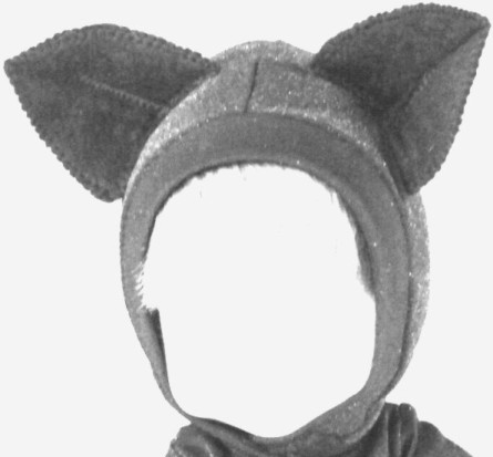 There is a dart in the middle of the ear to shape it. Iron the dart flat. The ears are not as far back on the hood as the bunny ears are. The photos will give you an idea of where to place the mouse and kitty ears. The mouse ears are topstitched to the hood, by stitching across the base of the dart and also stitching up the dart a ways to stabilize the ear so it doesn't flop. The top stitching is hidden under the bow in this photo.