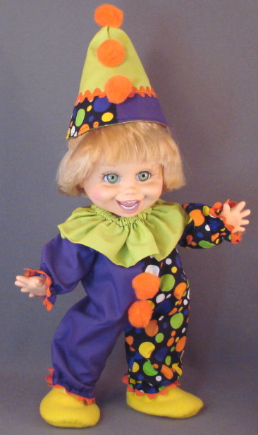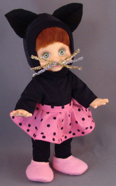 The circle skirt is a full circle with bias edging around the hem. You can use contrast bias tape or self fabric as shown. Here are instructions on HOW TO MAKE YOUR OWN BIAS TAPE. The circle skirt is only partially cut in back, just enough to allow the doll to step into the skirt.. The waistband fastens with velcro or a snap. The foil pipecleaner whiskers are held on with E6000 glue, which can be removed later. (If necessary I use our plastic cleaner to get the residue off.) Do not use superglue or liquid nails glue. You could also attach the whiskers with elastic cord wrapped around the head. The pink moon shoes are a bit over-sized, to give more of a comic appearance. We have also used these moon shoes as clown shoes and they work great: