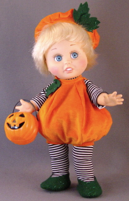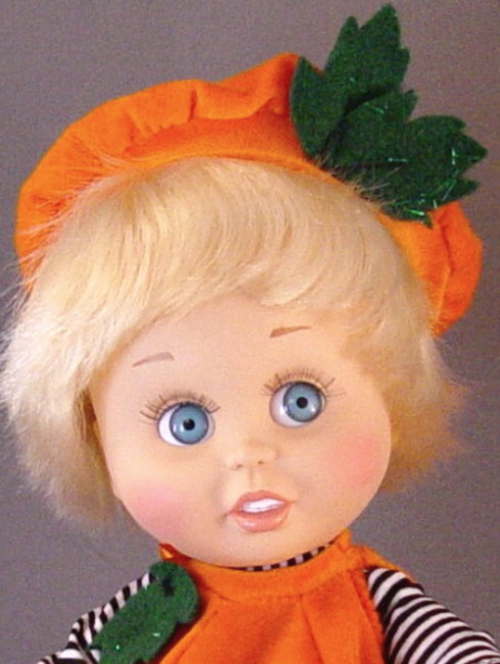 The Pumpkin is my favorite! We used a very vivid orange knit plushy spandex fabric. This is an unusual fabric and is available in the shop. But you can use bright orange felt or other fabrics for the pumpkin body. The pumpkin body pattern has more fullness than the snowball body. It is an over rounded ball, so if it's packed firmly the seams will be caved in a bit and look like the grooves running down the side of a pumpkin. I didn't pack my pumpkin tightly, it's a bit slouchy / saggy but that looks ok too because the nearly neon orange color gets the point across and pumpkins do come in irregular shapes. The pumpkin body is made the same way as the snowball body. Attach a leaf at the shoulder where the velcro fastener is. We used green felt with sparkles in it, available at craft and fabric stores in 8.5 x 11 inch sheets. The shoes are made of the same felt. One sheet is enough for shoes and the leaves, too.