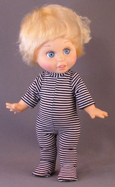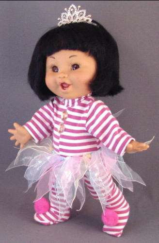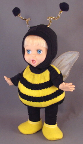 The Ballerina and the Bumble Bee are variations of our basic costume patterns. The ballerina wears a basic body suit with a tutut. We used a ribbon scrunchy for the tutu. They are available at bargain stores. The Bumble Bee uses the Snowball body, with wide black braid stitched around the body. We used bright yellow felt. The wings are from a craft store, with extra glitter glue applied for sparklies.