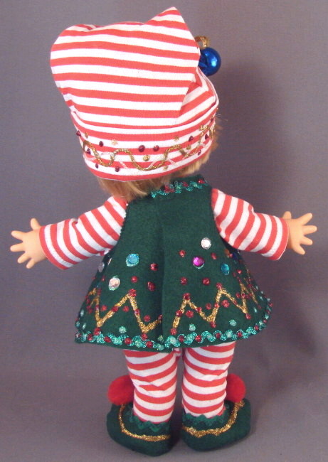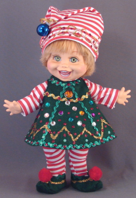 The Christmas Elf pattern is another favorite! The red & white striped fabric is a standard t-shirt knit (single knit), so we used the Body Suit Pattern B, which is a more generous cut. The tshirt knit fabric isn't as stretchy as spandex. The hat has a seam on both sides of the head, up to the point. Stitch the side seams first, then fold the deep cuff and hem at the line indicated, using a stretch stitch. Fold the cuff and the hat is basically done. But it still needs decorating! Remember to hang a pom pom or ornament on the end of the hat. The tent dress is made of felt and there is no sewing to be done on this dress, other than apply velcro fastener to the neck in back. The tent dress is generously decorated with metallic rick-rack, craft jewels and glitter glue. (We sewed the rickrack to the dress.) We also applied glitter glue to the cuff of the hat, and the shoes. Decorating is what makes this outfit so outrageous. This could also be a fun craft project for kids.