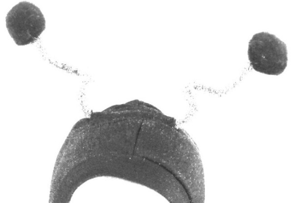 I braided three foil pipecleaners together so they would be more substantial as antennae. This faded closeup of the Bumble Bee hood shows how we attached the antennae: use a narrow piece of the knit fabric , about 3 inches long and folded lengthwise so the raw edges are tucked under. Stitch it to the hood, on either side of the pipecleaner to secure it. That's all you need to do, the antennae are secure! Then arrange the pipecleaners in a whimsical spiral and glue a black pom pom to the end of each antennae. I turned ends of the pipecleaners back, so they looked like a small hook, and this gave a larger base to glue the pompoms to. | |||||||||||||