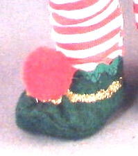 The elf shoes are turned up a bit on the toe. This faded photo helps you to see some details. To pull the toe in, we stitched some elastic on the upper seam, inside. This causes the pointed sole to turn up. The gathered part on the top of the shoe needs to be covered with a pom pom. We stitched rick-rack around the top edge of the shoe, to match the dress and to reinforce the raw edge of the felt. We applied gold glitter glue but how you decorate is up to you.