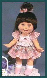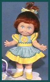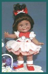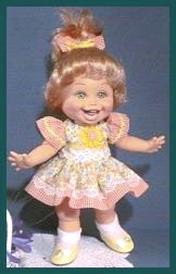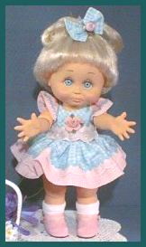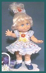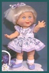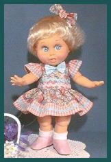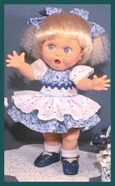 PrillyCharmin's Fashions My dresses were designed especially for Baby Face dolls. I was especially influenced by the Vogue designs for Ginny, and have slowly developed my own pattern and designs over the past year. Click on each "thumbnail" below to see a larger picture of each doll. My dresses will fit other 12 to 15 inch baby dolls and toddler dolls of similar shape, as well as the Effanbee dolls such as Baby Face, Gumdrop, and Suzie Sunshine which are a little bit taller. The dresses also fit Vogue's Angel Baby. The diapers are the Baby Face design, and do not fit all dolls. Many of these dresses were created especially for the doll that is wearing them. I try to enhance the eye and hair color for each of the Baby Face dolls, as well as complement the personality. ![]() Web page design by