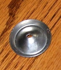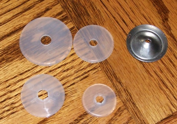 Then insert the plastic washer, pushing the bead in first and sliding the disk in somewhat sideways. Be very GENTLE as you push, because the vinyl is not very flexible. In fact, it seems to be somewhat brittle. So push carefully, firmly, slowly... so the vinyl doesn't get cracked.