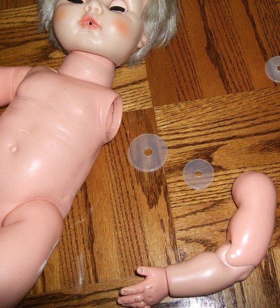 Now heat up the doll's shoulder (with hairdryer) and when it's somewhat warm and flexible, push the plastic washer disk into the shoulder, using hemostats or needlenose pliers to help you do the pushing.