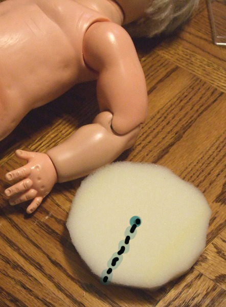 Cut a generous circle. Cut a slice to the center (as indicated by dotted line) and then work the foam rubber into the shoulder, wrapping it around the cord in the center.