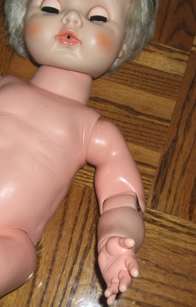 Baby Dollikin is all vinyl, but she is made of a thick vinyl material that is not quite the same as either hard vinyl or soft vinyl. It feels a bit like crayon. The vinyl material was apparently very thick and viscous because many of the Baby Dollikin dolls have ripples and swirls in their vinyl. This vinyl is durable and holds it's color well, but may not be as flexible or resilient as other vinyl materials of that period.