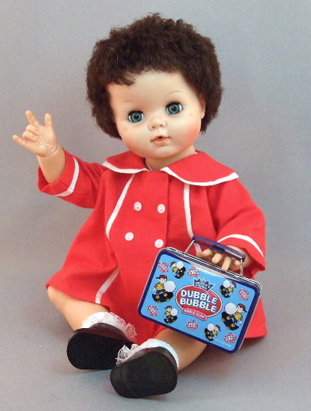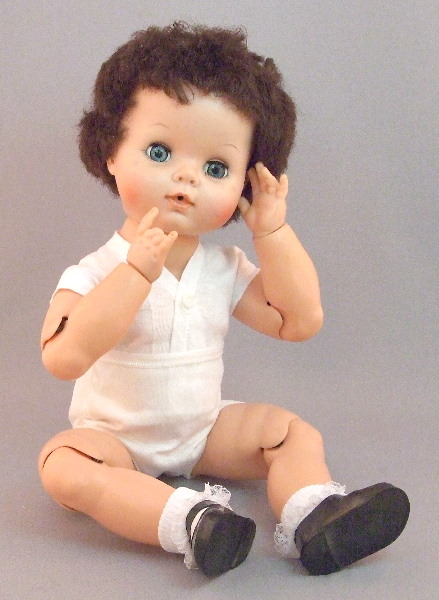 Baby Dollikin was made by the Uneeda Doll company in the late 1950's. She is a very unique multi-jointed babydoll with spring joints that hold on the arms, legs and head, and metal hinge-joints at elbows and knees. Her wrists twist and turn, also.