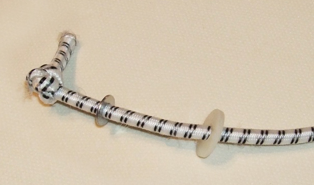 3. This picture shows how the left leg will be arranged; just imagine that the socket cup is still INSIDE the body. The copper piece is called a crimp sleeve. It slides easily onto the elastic cord.