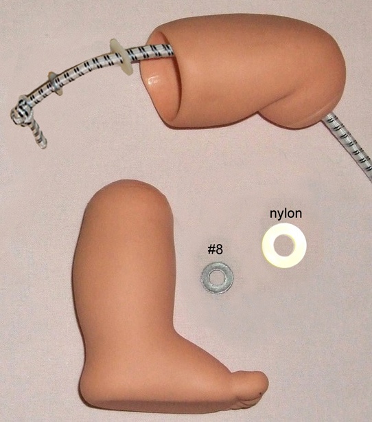 - Next, use a small needlenose pliers and grab the nylon washer as well as the metal washer together. Push them into the lower leg piece. This is especially important when stringing the BathTub dolls: if you try to push the washers in one at a time you won't be able to do it because the Tubby legs don't have much of a cavity. -- With the regular Baby Faces you can slide the two washers in separately if you want to, but it's better to do them together. You may need to heat up the leg a little bit if the opening doesn't have enough flexibility.